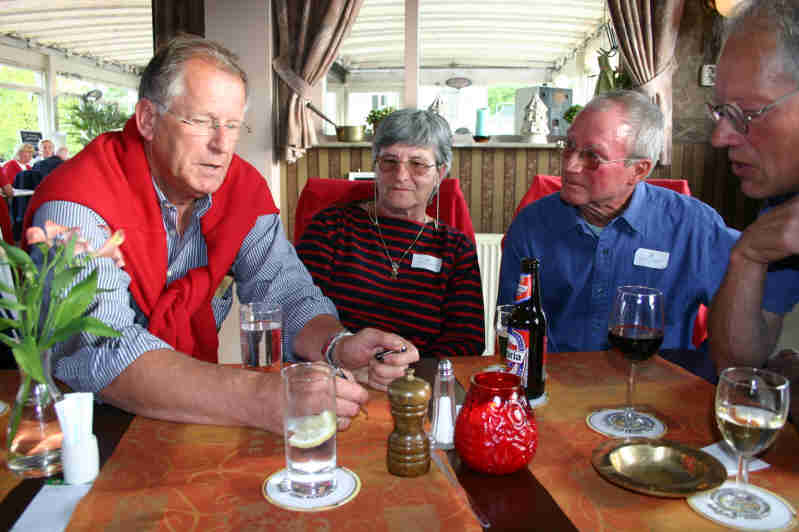 Op zondagmiddag was er een speciale bijeenkomst met enkele bijzondere gastsprekers. Jasper van de Meijden, de initiatiefnemer van de bouw van de Dartsailers, en destijds tevens eigenaar van de Holland Boat Company, de werf waar in de 70-er jaren ruim 110 Dartsailers werden gebouwd, vertelde de nodige wetenswaardigheden over “zijn” Dartsailers, aangevuld met een paar leuke anekdotes over bijzondere ervaringen met de verkoop van nieuwbouw schepen. Ook Willem de Vries Lentsch, de ontwerper van de Dartsailers was naar deze bijeenkomst gekomen, om aan de aanwezigen het een en ander te vertellen over het ontwerpen van deze schepen. Op zijn kenmerkend nuchtere wijze vertelde hij veel interessante zaken over het ontwerp van een spitsgat schip, de typische kenmerken en het gedrag op zee. Zijn stellige uitpsraak dat een Dartsailer niet kan omslaan leidde tot een zucht van verlichting onder de aanwezige dames. Na afloop was er gelegenheid tot het stellen van vragen aan de beide heren. Van deze unieke kans werd goed gebruik gemaakt.