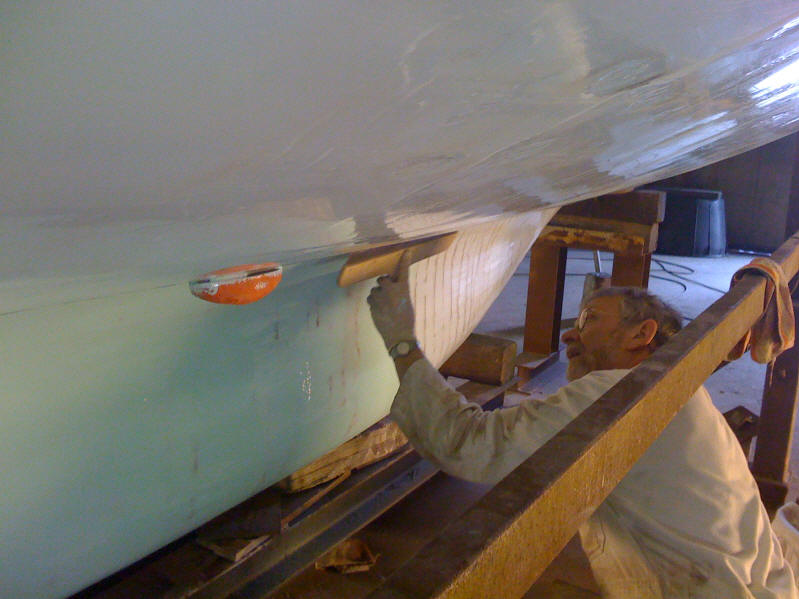 De boot heeft een jaar in de stalling op de werf gestaan omdat ik in 2008 voor mijn werknaar een poos het buitenland werd uitgezonden. Eind 2007 is het gehele onderwaterschip “geschild” door een professionele aannemer. Het polyester is hierdoor langere tijd aan de buitenlucht blootgesteld waardoor het goed gedroogd is. Tijdens het droogproces is de romp enkele malen met zoet leidingwater afgespoeld waardoor stoffen, die bij het verdampen waren achtergebleven, grondig werden verwijderd.