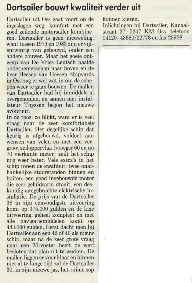 In het bovenstaande artikel is veel te lezen over de eerste bouwactiviteiten van de Dartsailers. In het volgende artikel wordt de Dartsailer 38 aangekondigd, waarbij verwezen wordt naar de ontwerper Willem de Vries-Lentsch.