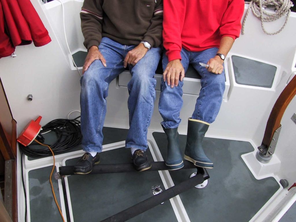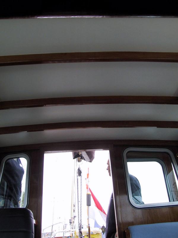 Van links naar rechts: Extra rooster in de kuip om staand goed over het stuurhuis heen te kunnen kijken; ventilatieluik in perspex dakraam; warmwaterboiler onder de kuipvloer; rolgrootzeil; voetensteun voor tijdens zeilen (simpel verwijderbaar); kuiptafel op stuurkolom