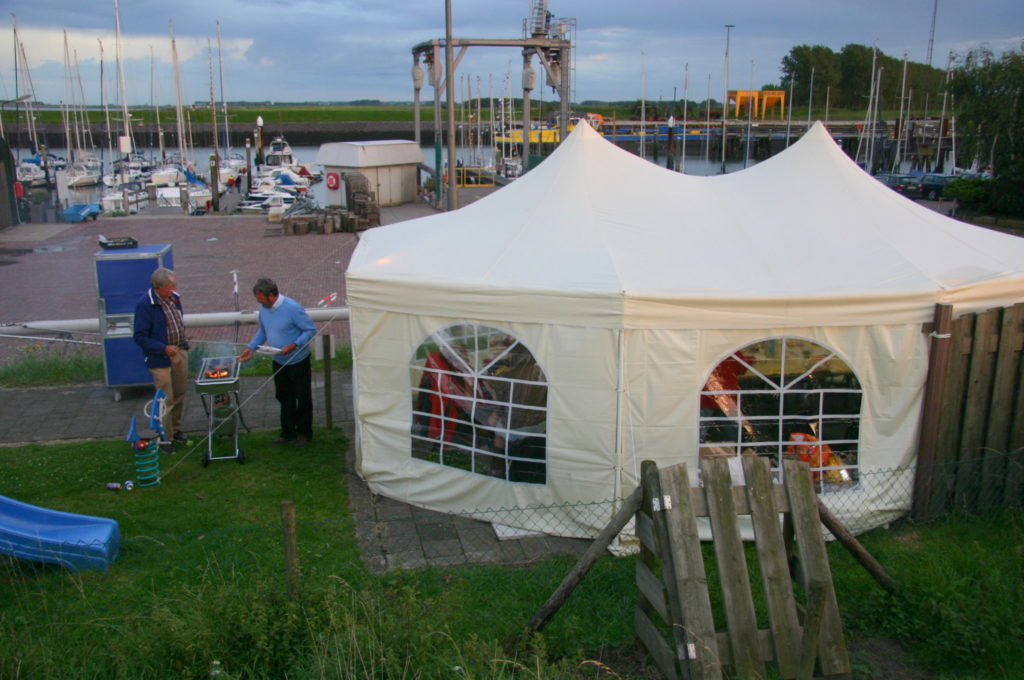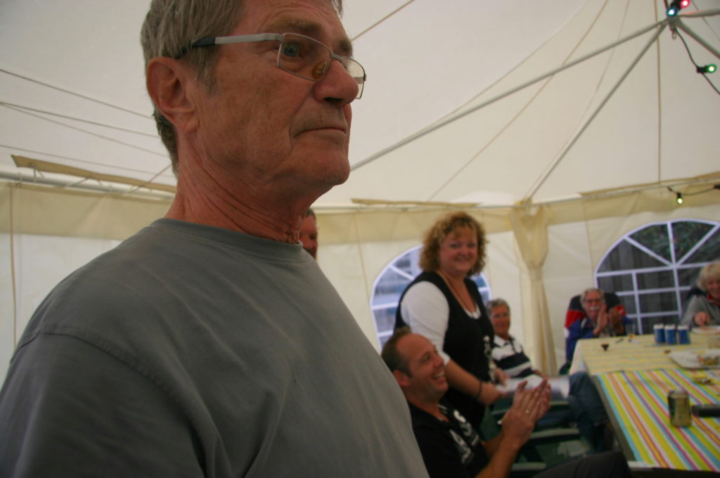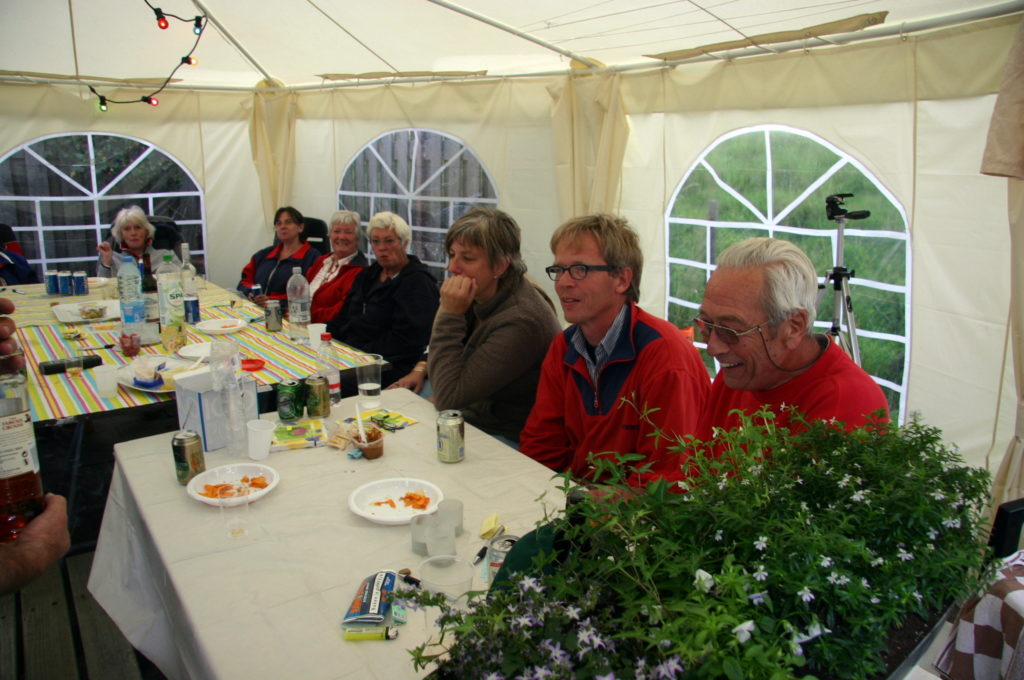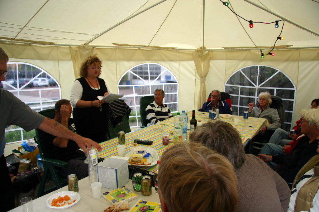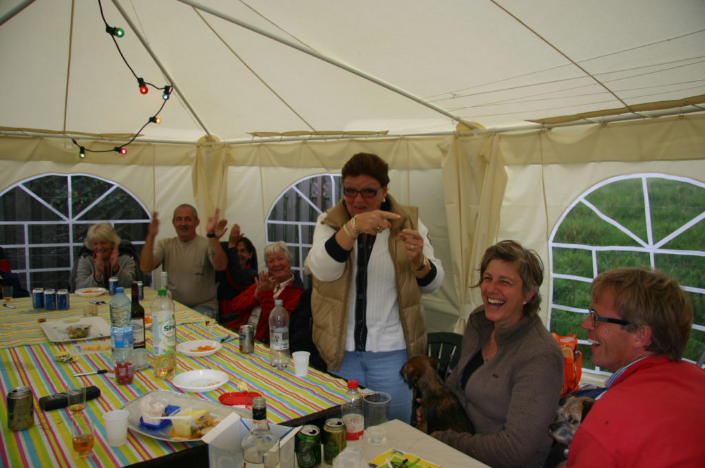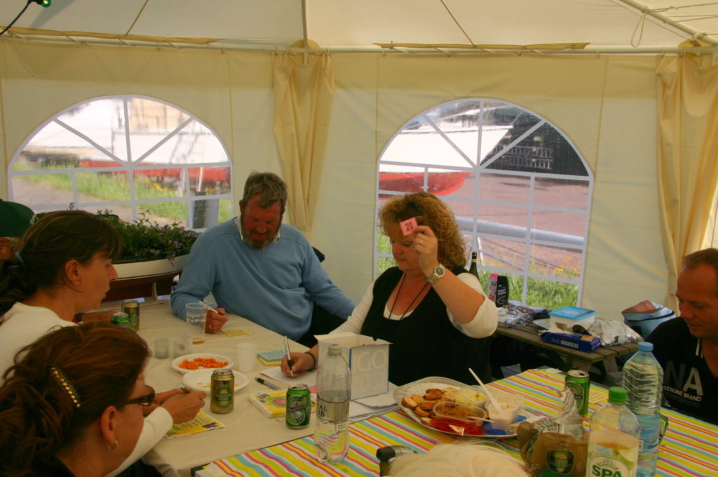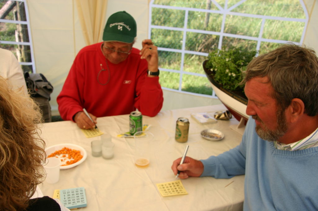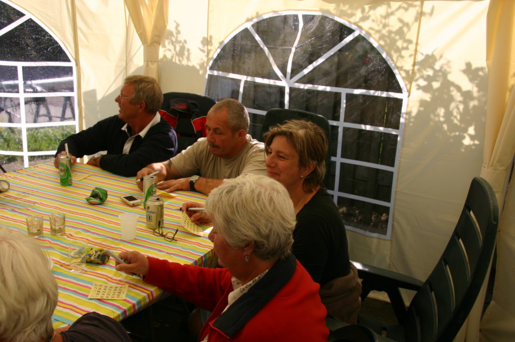 De organisatoren Erik en Carina Driessen hadden voor de gelegenheid een partytent geleend, die prima dienst deed als centrale ontmoetingsruimte. Door het barre weer moest het programma wat worden aangepast, maar daar wist Carina wel raad mee door het organiseren van een echte Bingo (!) met leuke prijzen. De eerste ronde wilden sommige deelnemers niet mee doen, maar toen de stemming er goed in zat deed vrijwel iedereen mee met de tweede uiterst spannende ronde. De geestige opmerkingen waren niet van de lucht toen bleek dat sommigen nog nooit aan dit spel hadden meegedaan en steeds hulp nodig hadden.