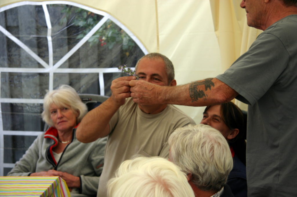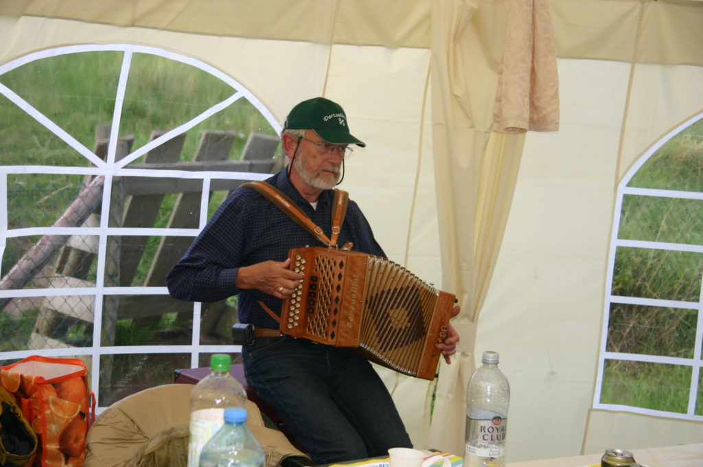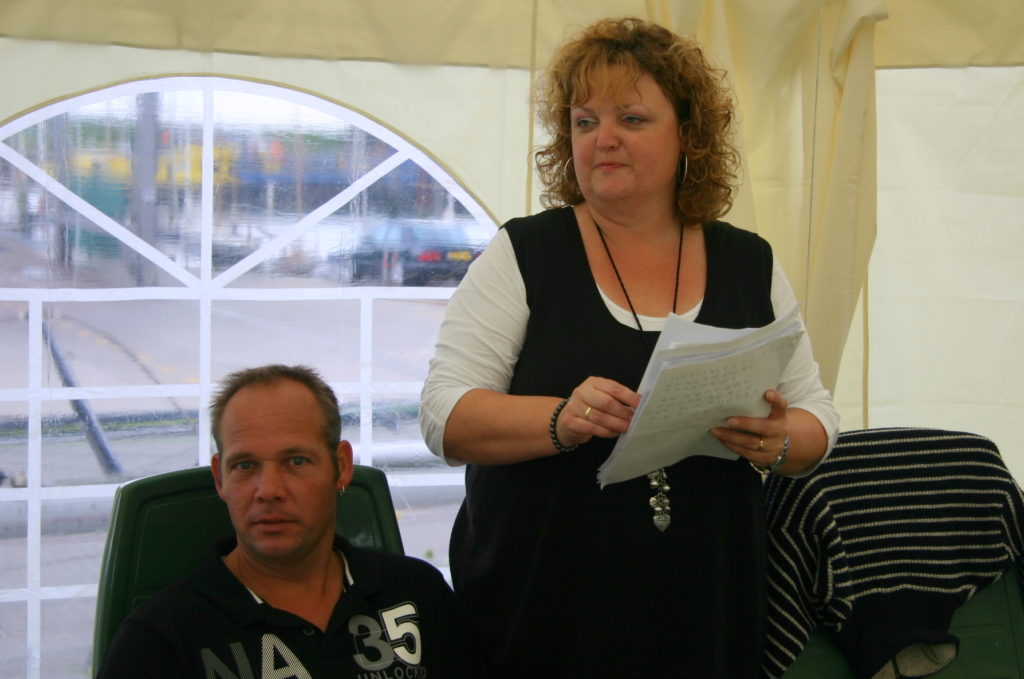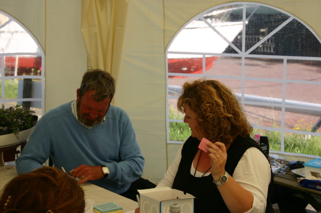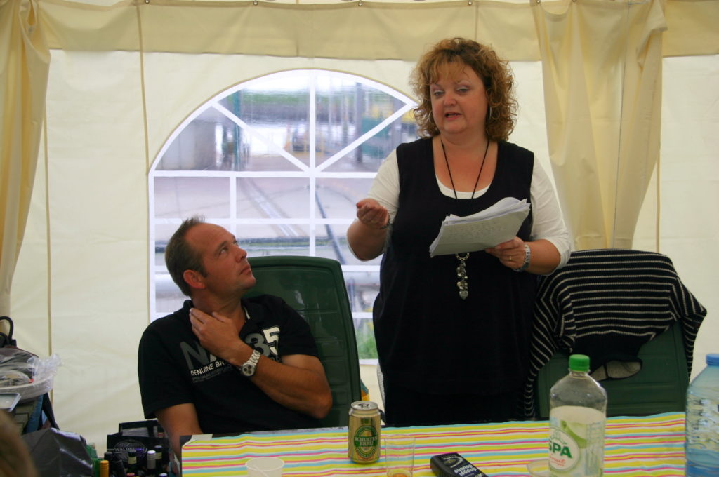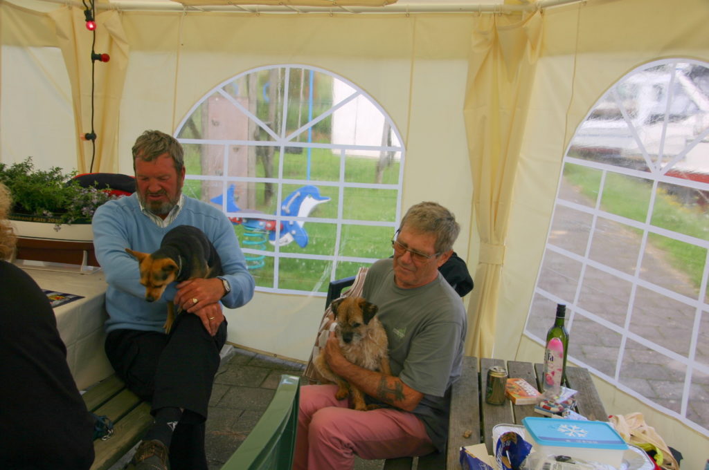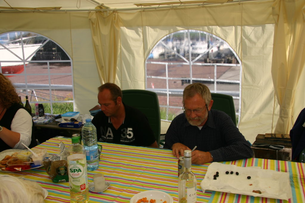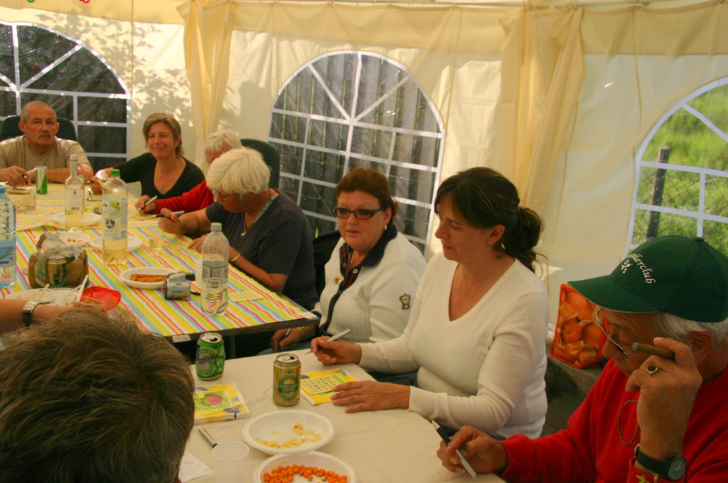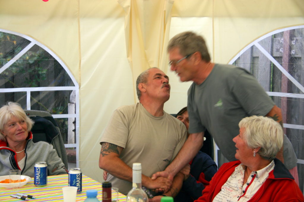 De organisatoren Erik en Carina Driessen hadden voor de gelegenheid een partytent geleend, die prima dienst deed als centrale ontmoetingsruimte. Door het barre weer moest het programma wat worden aangepast, maar daar wist Carina wel raad mee door het organiseren van een echte Bingo (!) met leuke prijzen. De eerste ronde wilden sommige deelnemers niet mee doen, maar toen de stemming er goed in zat deed vrijwel iedereen mee met de tweede uiterst spannende ronde. De geestige opmerkingen waren niet van de lucht toen bleek dat sommigen nog nooit aan dit spel hadden meegedaan en steeds hulp nodig hadden.